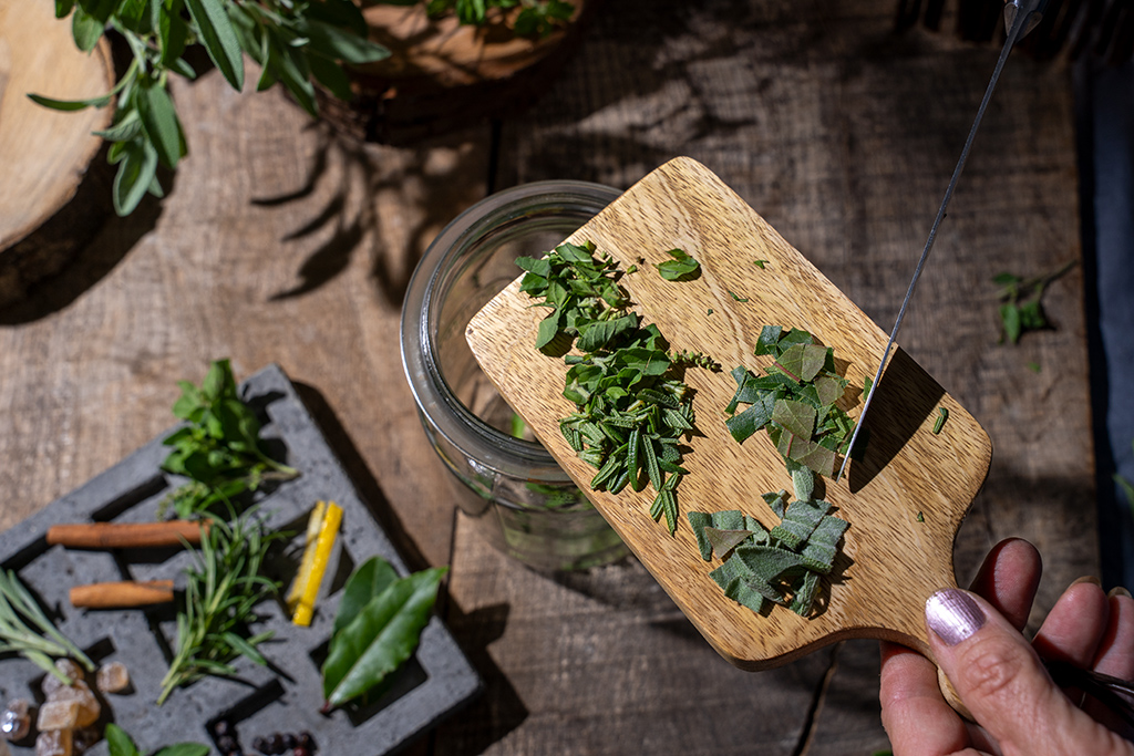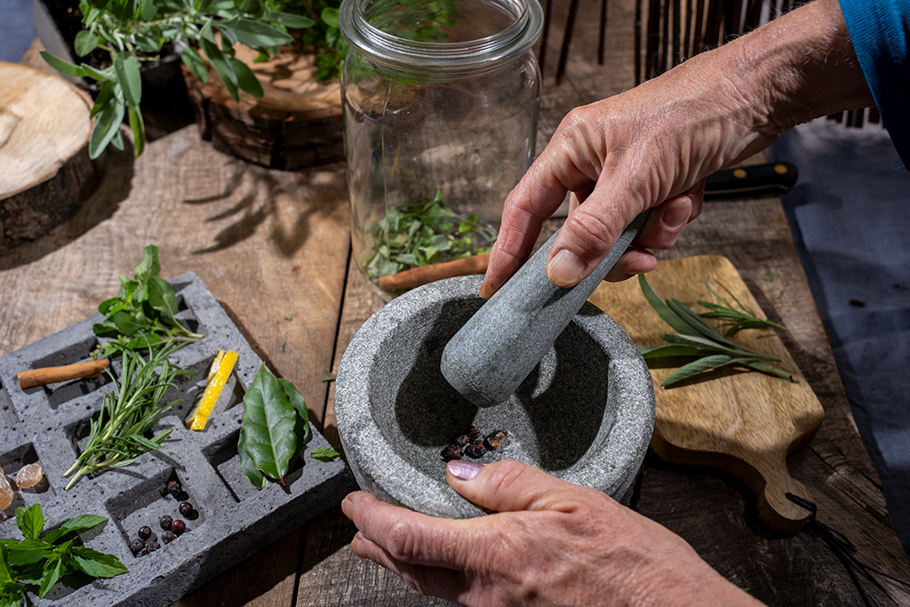 Die Wacholderbeeren werden im Mörser zerdrückt. Die Kräuter müssen nach dem Waschen gründlich trocken geschüttelt und etwas angeschnitten werden.