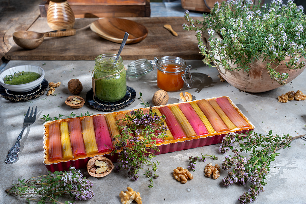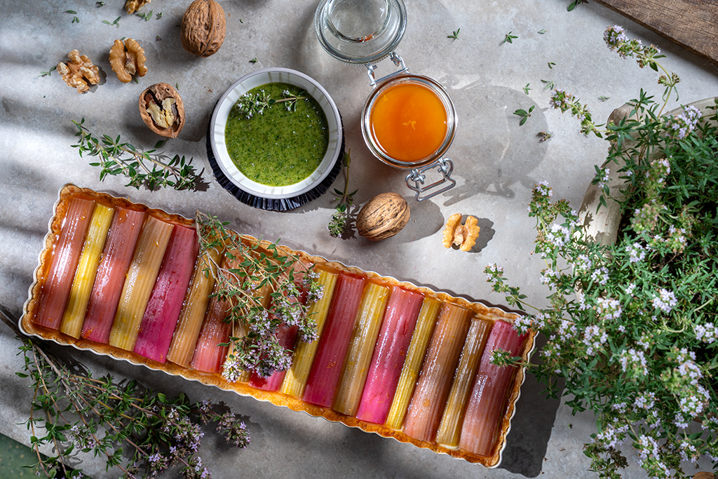 Den abgekühlten Tarteboden vorsichtig aus der Form lösen. Die Crème Pâtissière glatt rühren, auf den Boden geben und glatt streichen. Dann die Rhabarberstücke auf die Creme setzen und mit etwas Sirup aus der Auflaufform bestreichen. Nach Belieben mit süßem Thymian Pesto garnieren und bis zum Servieren kaltstellen.